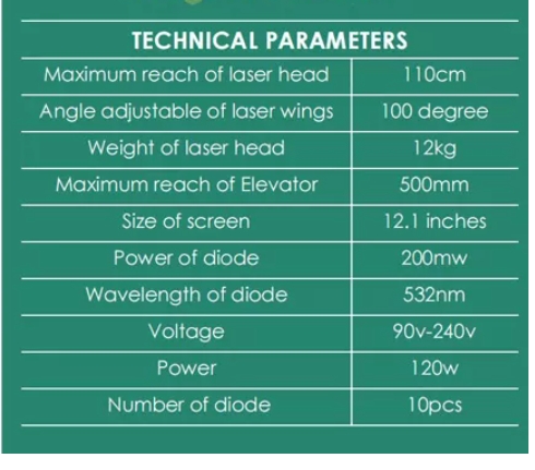 10d green light laser therapeutic deviceLamp 5ANumber of diodes ten pieceswavelength 532 nmCovered area Approximately 30 mm * 800 mmPower output 1-50 mWDiode power 200 megawattsLaser needle wavelength 650 nmMaximum laser head range 110 cmAdjustable laser wing angle 100 degreesHow it works Pulsed, continuousScreen size 12.1 inchesMaximum lift range 500 mmCooling requirements air-cooledRotation speed Level 1: 8.8 courses / Level 2: 10 courses / Level 3: 12 courses / Level 4: 13 courses / Level 5: 15 coursesPower 300 wattsLaser head weight 12 kgInput power 220 AC/50 HzDimensions Dimensions 116 x 57 x 80cm