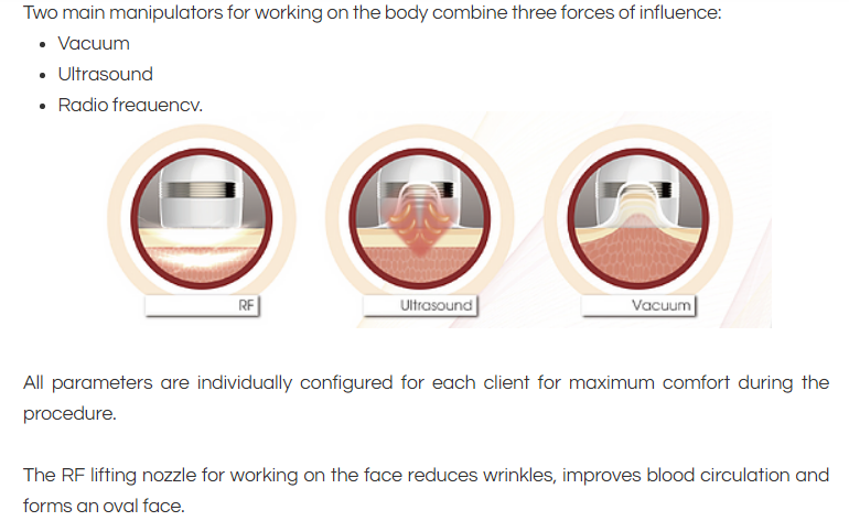 Working Mode: Ultrasound+ RF + Vacuum, Push Up, RF therapy
