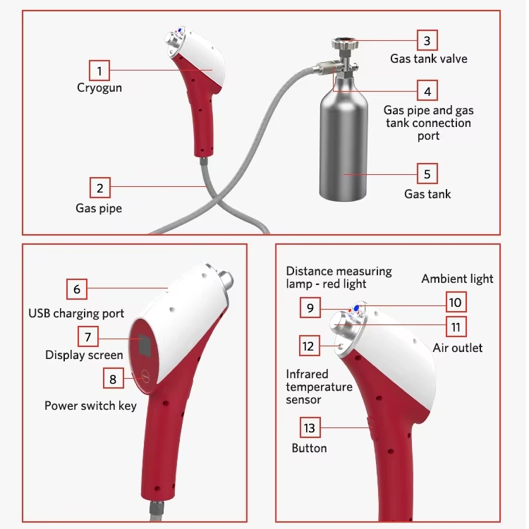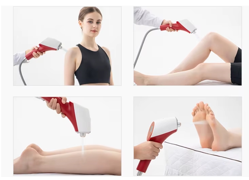CO2 shock cryotherapy involves the targeted spraying of high-pressure carbon dioxide. A small amount of CO2 crystals emitted at -78°C leads to a sharp drop in local temperature in the treated area. The vibrations generated by the CO2 spray create a strong autonomic reflex and stimulation of nerve freezing.