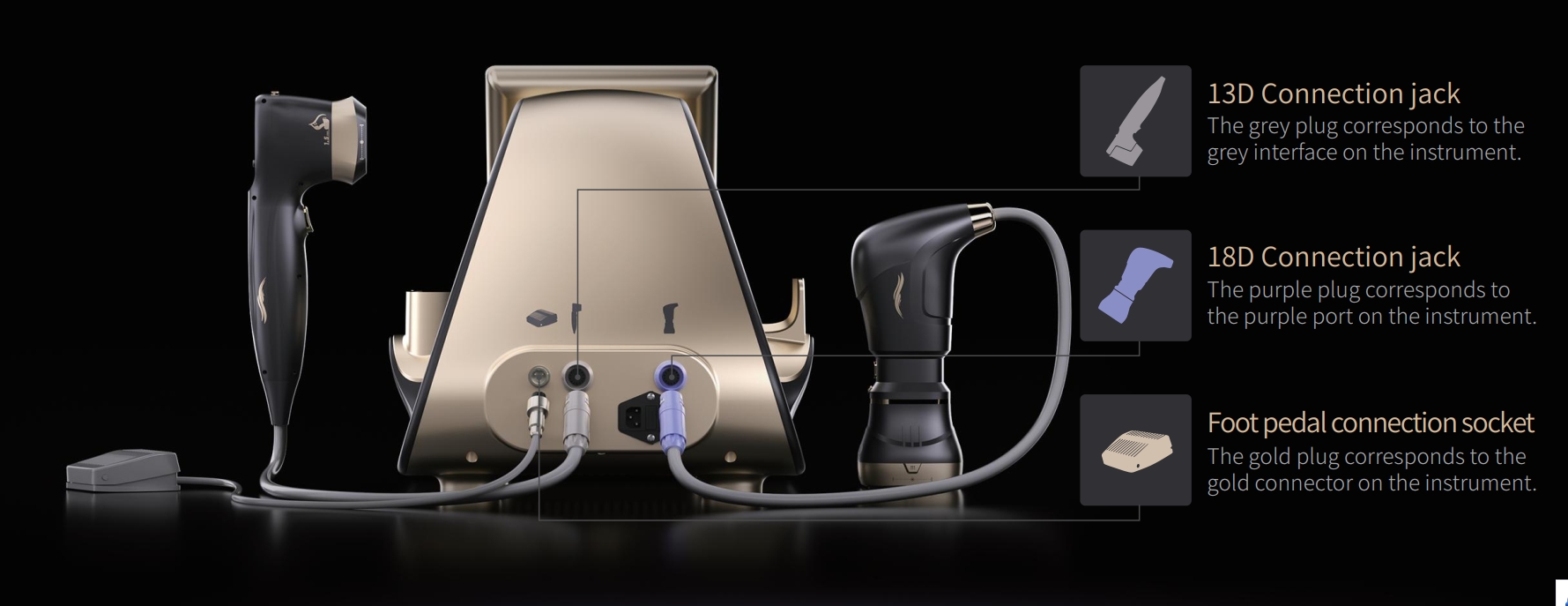 2) Multi-layer treatment: The HIFU handle comes with multiple cartridges (1.5mm, 3.0mm, 4.5mm, etc.) that allow for precise targeting of different layers of the skin. The RF handle offers a range of depth options (from 6.0mm to 18.0mm), which increases its ability to treat fat and deep tissue.