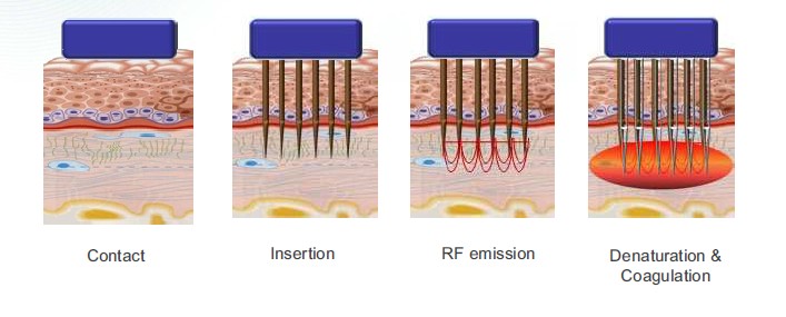 Fractional Microneedle Radiofrequency - uses thin microneedles that penetrate directly to the collagen fibers. In a fraction of a second, a precisely controlled dose of thermal energy is released from the ends of the needles. Strong heating of collagen and elastin fibers stimulates their subsequent shutdown. An immediate lifting effect is visible. At the same time, healing processes in the subcutaneous tissue and the formation of new collagen are started.
