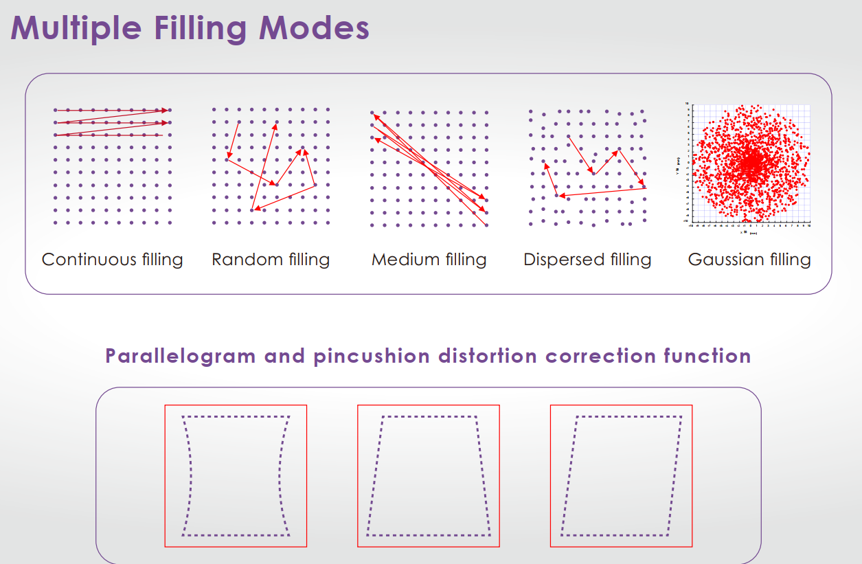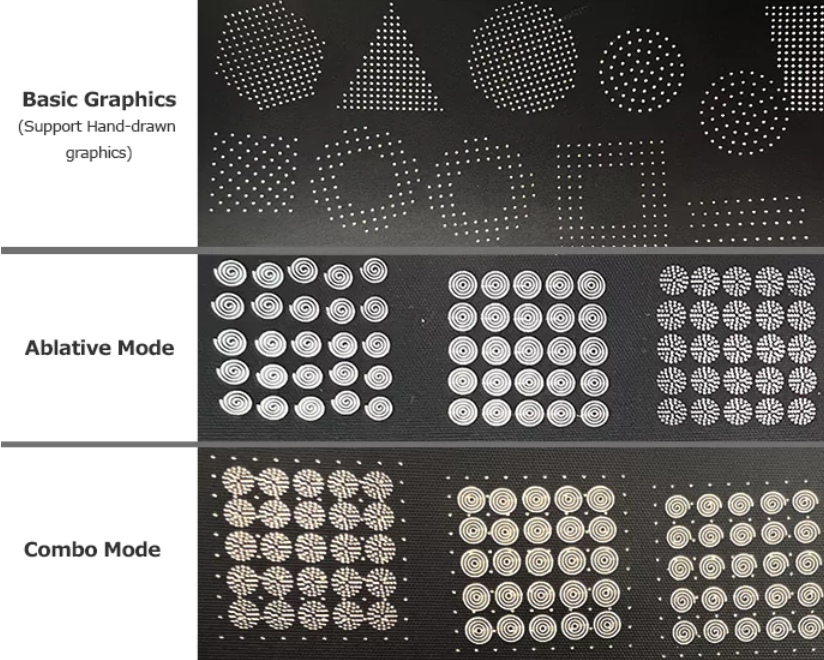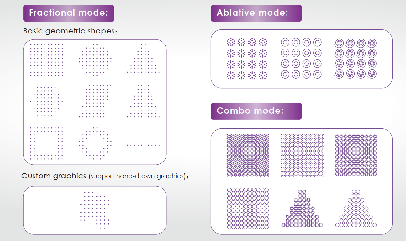 The laser supports different scanning patterns for more precise treatment adjustment, including geometric shapes, fractional matrix patterns, random and uniform filling, Gaussian filling, and custom hand-drawn patterns.