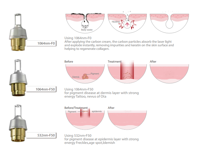 1) Treatment of pathological changes of pigment skin, pigmentation caused by a mixture of color pigments, stains, freckles, birthmark, nevus, etc.