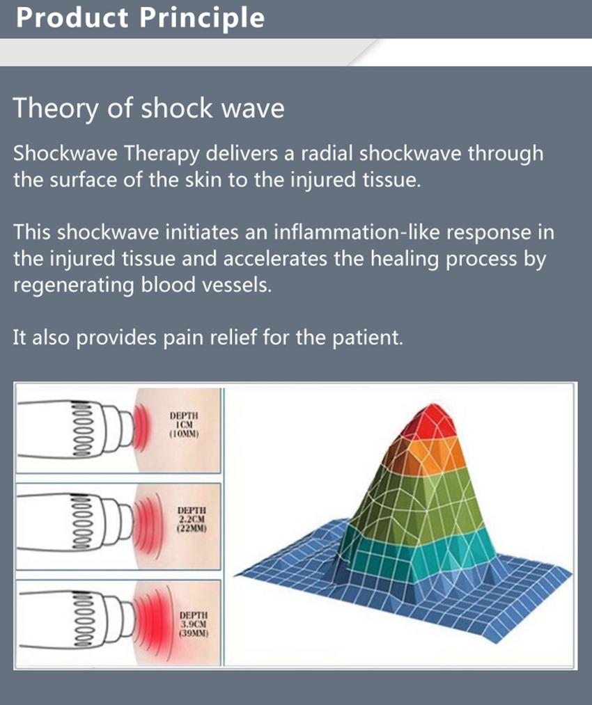 Shockwave Advantages:1. High effectiveness, fast relieve pain.2. Noninvasive, no anesthetic, convenient and fast3. Each nursing only 20 minutes, 5-10 nursing each session.4. Widely applied to different soft tissue treatments.